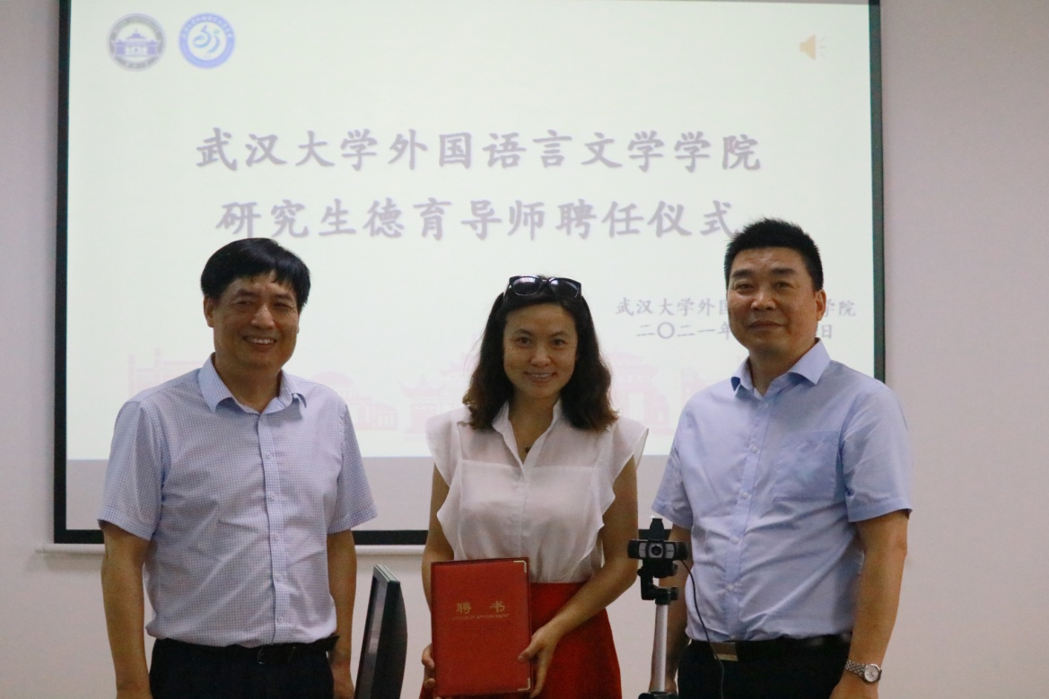 研究生办公室主任周新元宣读聘任文件。为落实学院“三全育人”综合改革实施方案,切实加强研究生导师队伍建设,进一步改进研究生思想政治工作,结合学院研究生工作实际情况,学院党委研究决定,在英语语言文学、法语语言文学、日语语言文学、俄语语言文学、德语语言文学、外国语言学及应用语言学、翻译学和MTI等8个研究生学位点聘任9位研究生德育导师。具体名单如下:黄忠、李丹丽、苏昉、李圣杰、田园、徐琼星、赵玲、黄敏、胡玲。