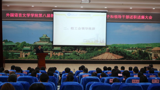 院长马萧作了2018年度学院工作报告。他表示,在过去的一年,全院师生凝心聚力,开拓创新,奋力开创了学院发展的新局面。他从学科建设、队伍建设、教学工作、科研工作、外事交流、人才培养、管理服务这七个方面,对学院工作取得的成绩和存在的不足进行了总结。新的一年,学院领导班子将紧紧围绕“双一流”建设目标,提高忧患意识,切实打好人才攻坚战,全面深化绩效改革,进一步求真务实、开拓进取,带领全院师生员工为建设国内知名外国语学院而努力奋斗。