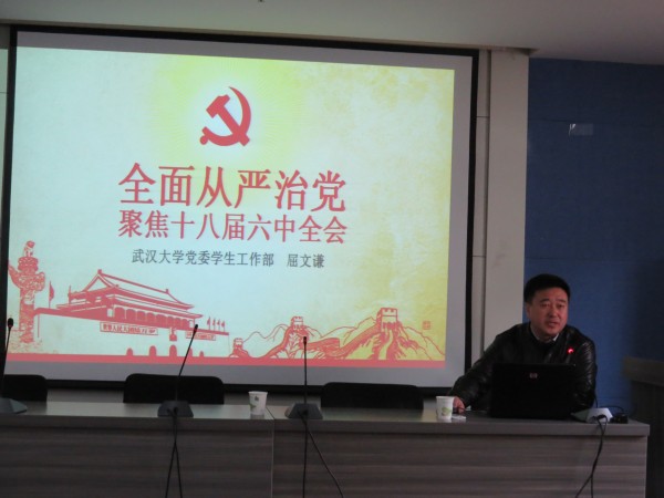 党的十八届六中全会精神宣讲团成员、党委学工部部长屈文谦来学院,为师生作题为《全面从严治党——聚焦十八届六中全会》的学习报告,全方位地解读了十八届六中全会的精神。参加此次学习会的有红桃视频