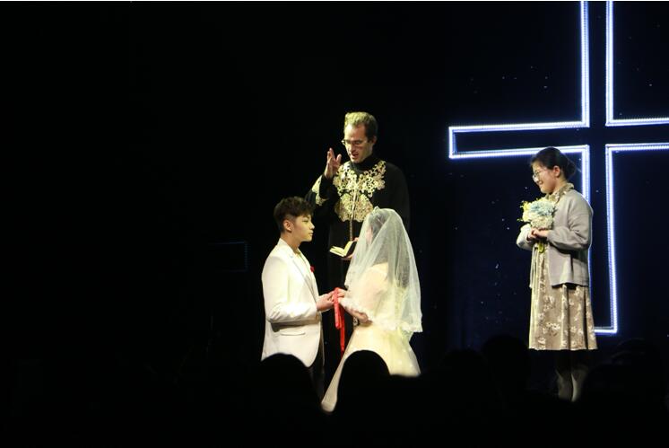 12月15日晚上七点,英语舞台剧《罗密欧与朱丽叶》在武汉时代•新世界的舞台拉开了序幕。一段富有感染力的音乐缓缓响起,二十五名学生演员依次登场站定。灯光打上舞台,演员们朗诵了一段气势恢宏的开场白。旁白的一声“Here is a fight”,场上的演员分为两拨开展了一场戏剧化的打斗。铿锵有力的鼓声营造出紧张刺激的氛围。随着亲王的出场裁决,一段凄美的爱情故事徐徐展开:英俊深情的罗密欧,美丽单纯的朱丽叶,高贵强势的凯普莱特夫人,幽默仗义的茂丘西奥,霸气勇猛的提波特,虔诚智慧的神父等每一个角色都表现得恰如其分。舞会上英式古典舞蹈的唯美,二人初次见面时的热烈,阳台会那一幕情人互诉衷情的诗意,在神父的见证下罗密欧和朱丽叶完成婚礼仪式的浪漫,以及敌人街头相遇从争吵到打斗的激烈,都牵动着观众的心。尤其是罗密欧和朱丽叶在最后双双殉情的场面更是将演出氛围推向了高潮,伴随着大提琴浑厚深沉和小提琴含蓄纯净的音乐演奏,台下观众被深深触动,还有人默默拭泪。最终,这出浪漫感人的悲剧在掌声中完美谢幕。