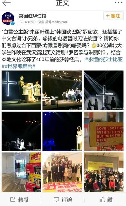 将莎士比亚的经典作品《罗密欧与朱丽叶》带给了武汉观众,让大家能亲身感受英国丰富的文化遗产,也为推进中英两国的文化交流迈出了更加坚实的步伐。