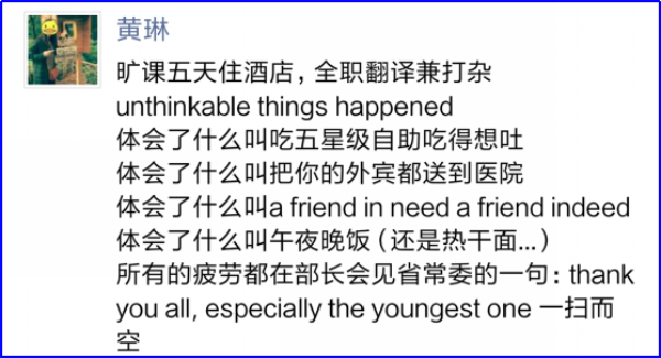 的志愿者联络员们与他们所接待的外宾朝夕相处,能够做到在正式场合有礼有节,在突发情况下处变不惊,在生活出行安排中事无巨细。开幕式前东湖宾馆入口车辆禁行,是志愿者们顶着烈日在几个入口与会议中心间反复奔走,测量步行时间,绘制路线图;重要外宾突发高血压、腿部不适,是志愿者们第一时间拨打120送他们去医院,在酒店悉心照顾;一位外宾希望在中国买一个“助行器”,是志愿者们深夜在微信群里讨论最佳的购买方式……志愿者们的服务得到了组委会和接待单位的高度评价,他们纷纷表示已经“离不开”我们的志愿者。来自各国政府和商界的嘉宾们更是与志愿者们建立了深厚的友谊,依依惜别之时,他们表示这些志愿者是自己在中国“最美丽的相遇”。