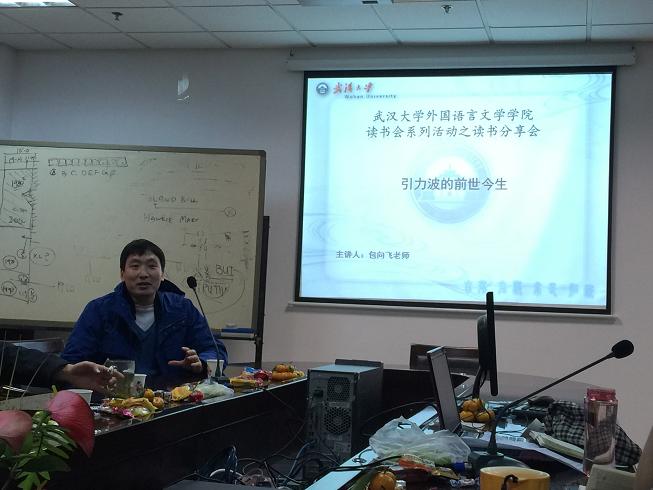 简短的开场白之后,首先由包老师为大家介绍引力波这一近期的热门话题。身为外语教师的包老师对这一物理学领域的概念毫不陌生,在介绍的过程中,无论是数学公式还是物理定理,他都是信手拈来,运用自如。同学们对引力波的好奇与疑问,在包老师风趣又简明的讲解下都得到了回应与解释。