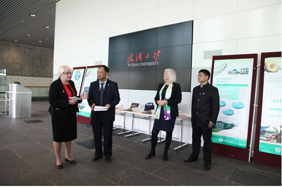 宣传片,活动现场还提供了武大明信片、武大校徽、钥匙串等精美礼品,送给参观展览的本地师生。