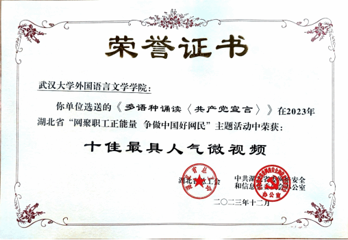 工会报送的作品《多语种诵读<共产党宣言>》荣获“十佳最具人气微视频”称号。红桃视频