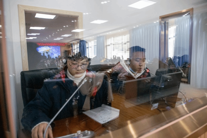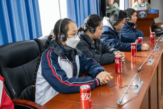 随后武大口译队领队助理柳竞林老师为同学们带来了一场精彩的同声传译展示。柳老师在同传箱里先后进行了中译英和英译中的同声传译,同学们纷纷戴上耳机,认真聆听柳老师的同传。