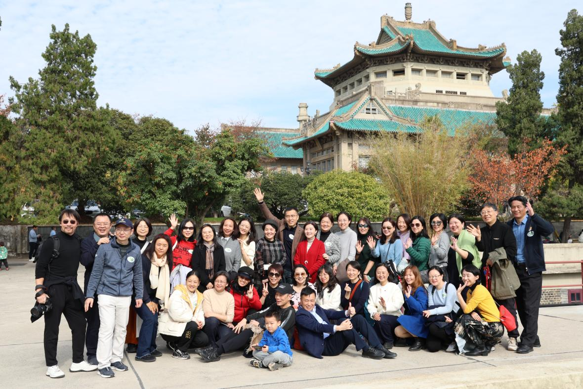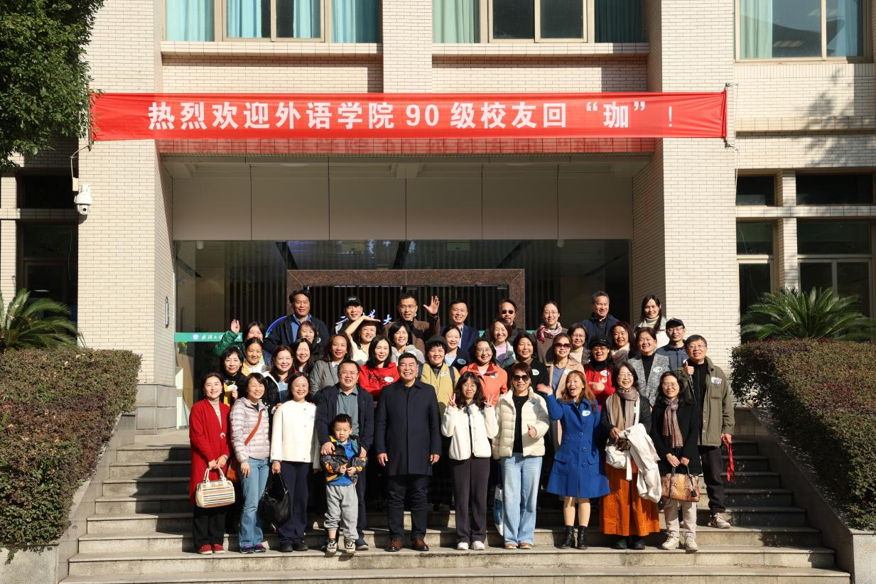 座谈会后,校友们在学院大门集体合影留念,齐声高呼“外院90,永远年轻”,用镜头定格下了这一温馨而美好的时刻。之后参观了樱顶、老外文楼、凌波门等充满青春记忆的地方。