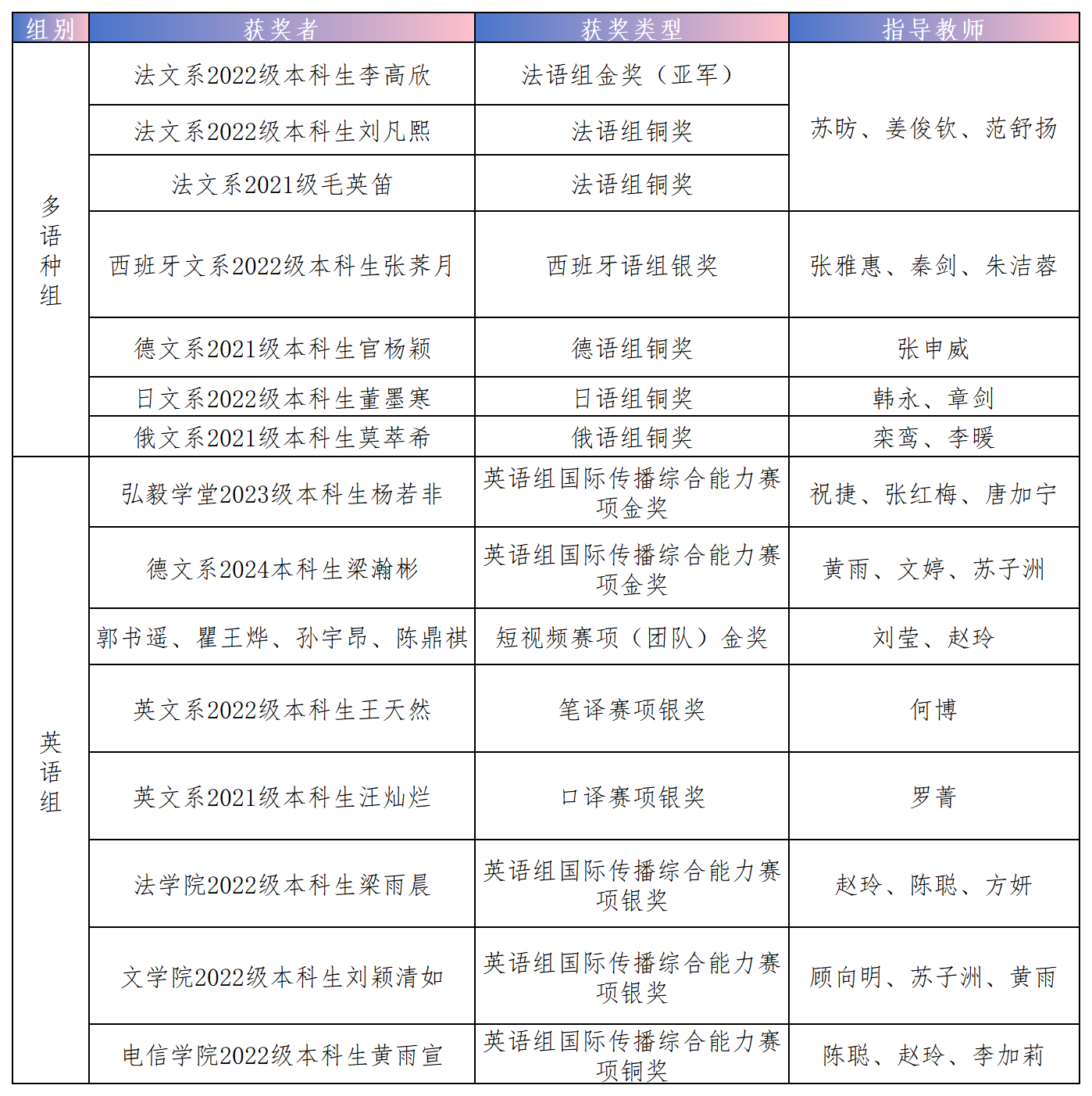 学子在英语组和多语种组比赛中表现出色,荣获国赛4项金奖(包括1个亚军)、5项银奖。