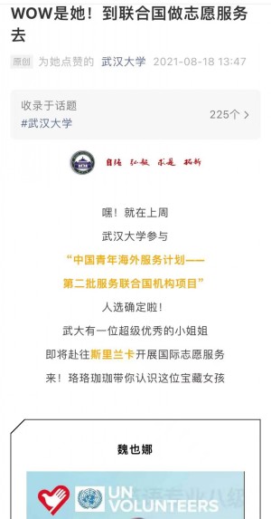 2019级英语语言文学专业研究生魏也娜同学从全国众多学子中脱颖而出,通过层层选拔成为“中国青年海外服务计划——第二批服务联合国机构项目”的人选,成为斯里兰卡国际服务志愿者,为传递真实的中国形象,促进中外文化交流而努力。