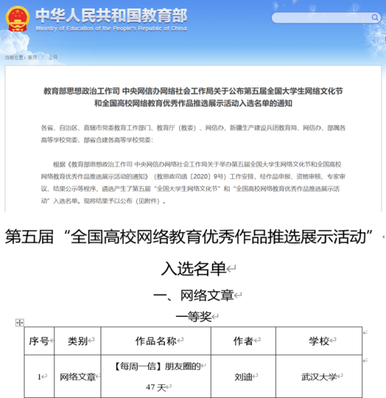 本科生辅导员刘迪的作品《朋友圈的47天》从报名的50000多件作品中脱颖而出,获网络文章类一等奖,红桃视频