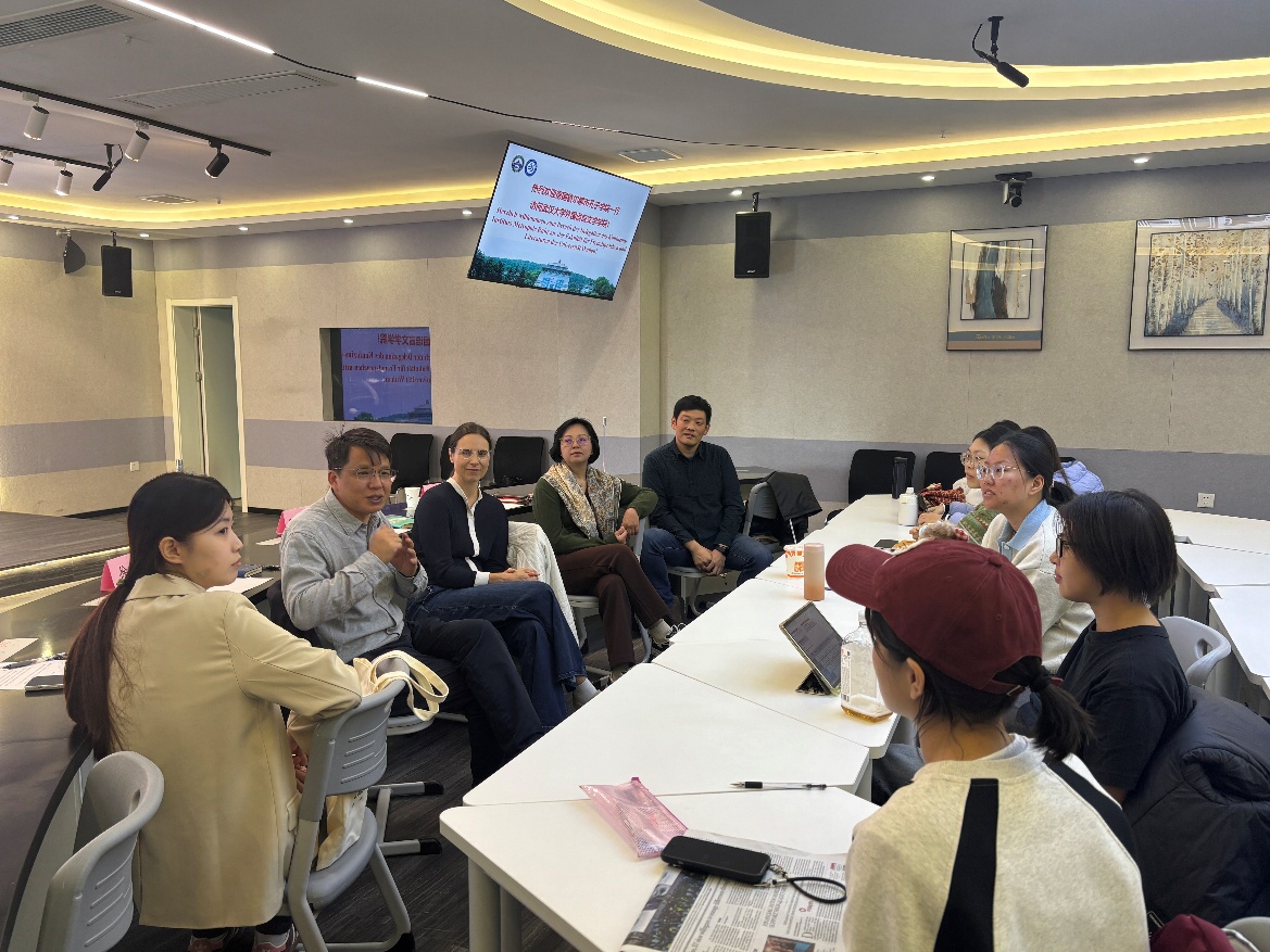 在自由交流环节,徐琼星老师邀请学生代表们逐一自我介绍。学生们就赴任志愿者的具体要求踊跃提问,内容涵盖申请条件、工作安排、生活技能要求、财务支持以及赴任前的专业知识储备等。Löhr院长及在场教师对上述咨询进行了详细解答:如针对志愿者申请前的准备,建议学生们可自学汉语国际教育相关课程、积极备考普通话等级证、并培养书法或国画等中国传统才艺;关于工作安排,提到志愿者周工作量约为12课时,并需参与行政及文化活动组织;同时强调了出色的教学能力和独立生活能力的重要性;此外关于教学工作细节,提到志愿者将参与周例会,使用《新实用汉语》作为核心教材,并承担一定的HSK考前辅导任务。