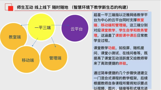 基于大学英语部目前正在进行WeModel教学模式改革的实际情况,郭懿老师从珞珈在线和学习通的关系、课程建立(WePrepare)、师生互动(WeExplore & WeCreate)、学习评价(WeEvaluate)、数据统计(WeReflect & WeResearch)等五个方面展开讲座,提出用“学习通”赋能WeModel教学。郭懿老师首先介绍了超星学习通的“一平三端”教学系统,此系统能助力线上线下、随时随地的师生互动,有利于智慧环境下教学新生态的构建。接下来她列举了学习通的“通知、作业、签到、选人、讨论、问卷、投票、群聊、词云、抢答、随堂测验、分组任务”等功能,并讲述了如何用课程大数据来进行学情分析和数据管理与导出的方法。