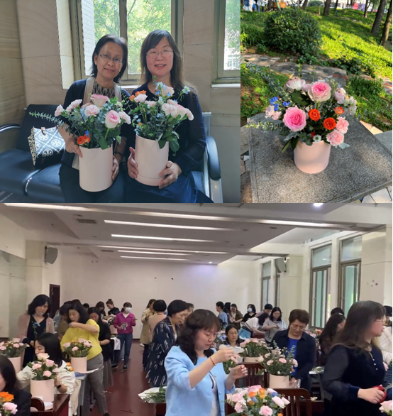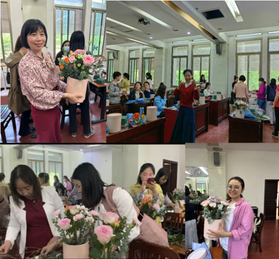 1033室进行,全校五十余名女教职工齐聚一堂,欢声笑语,创造精美多彩的花艺品。