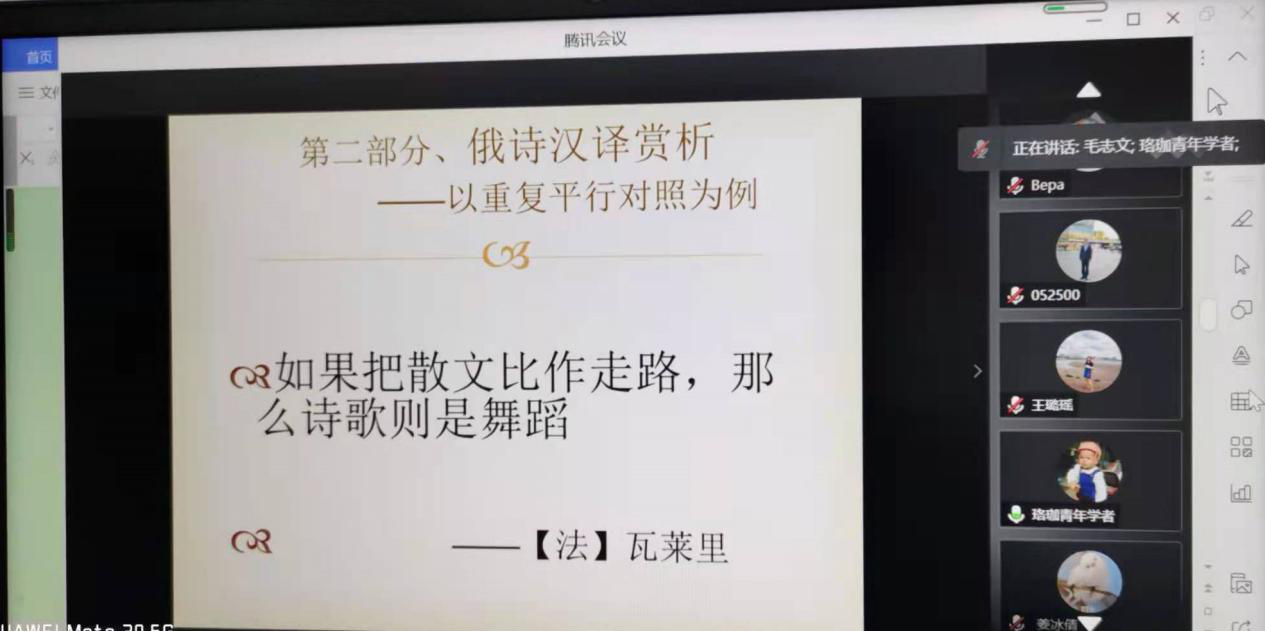 俄语系讲师毛志文老师为俄语系师生和校友做了题为“俄语诗歌翻译探索”的线上学术讲座,讲座以腾讯会议形式进行,时长1时30分钟。约30名俄语系师生、校友听取了讲座。