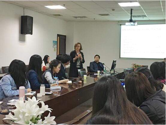 澳大利亚研究中心主任、英语系副主任黄忠老师主持了本场讲座。首先,黄老师向温卡表示了诚挚的欢迎,讲座在同学们的热烈掌声中开始。在简短的寒暄之后,温卡向在场的师生介绍了她选题的用意,她提到,对Life Writing(生命写作)这种文体的研究以前是被忽视的,而现在却越来越流行,国外很多高校已经为此专门开设课程,因而,让中国的学生们了解这种学术动态是很有必要的,也可以为大家提供一些新的研究对象和思路。为了让大家更好地理解生命写作学,温卡教授还列举了几个大家比较熟悉的文体,比如传记,自传,回忆录等,这些都是生命写作学的子类。而从事生命写作的作家很大一部分是移民或者是少数族裔的身份,与众不同的人生经历和多元的文化背景,让他们的作品更加有吸引力,因而生命写作也成为他们在不同文化背景下寻找身份定位的记录。
