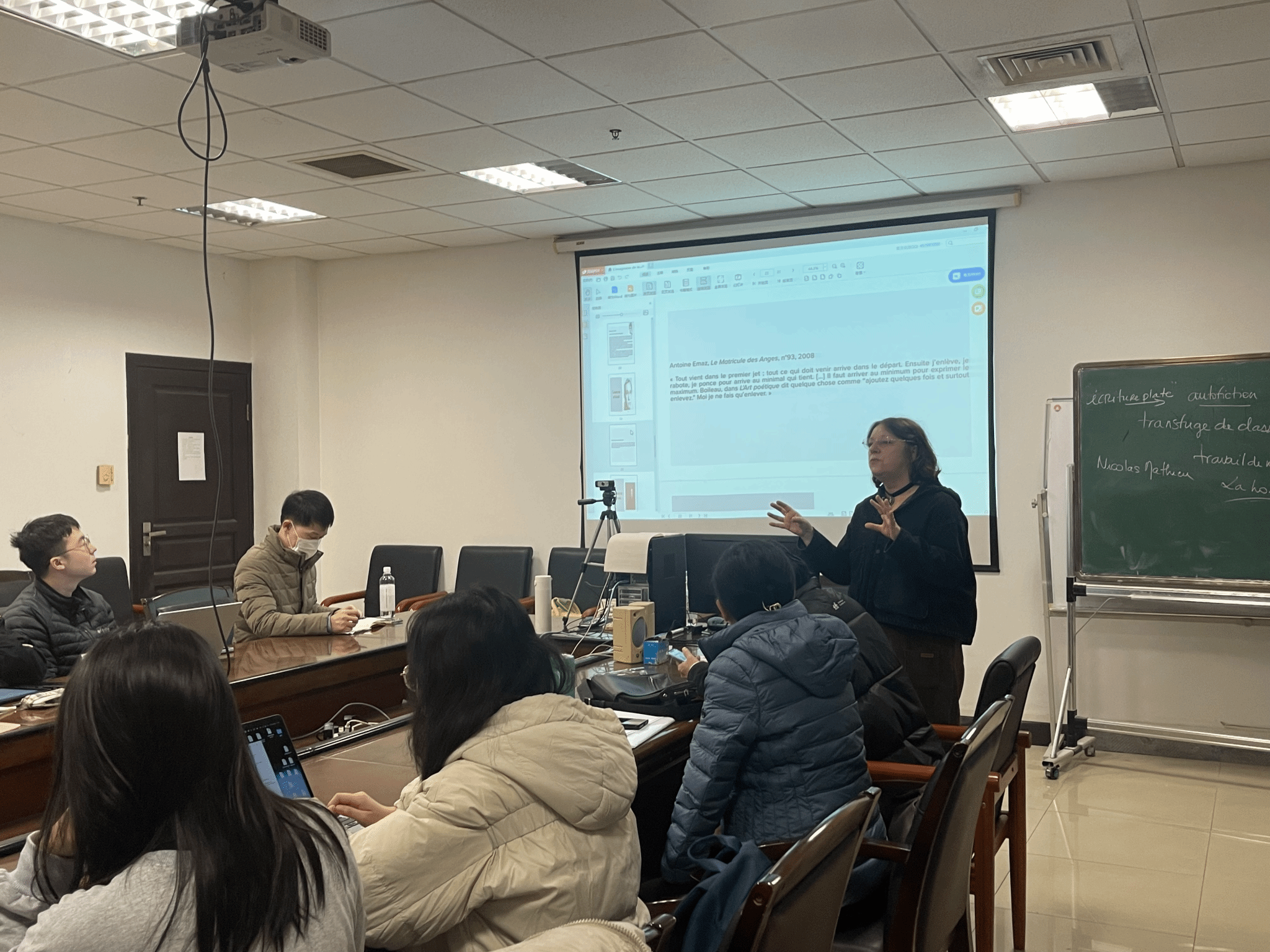 在系列讲座的最后,Wionet教授回归语言和词汇学的主题,主要从语言(langue)和语境(contexte)两方面向我们讲解了词汇分析的方法论。她从词的形态学和语义学两方面入手,运用大量生动有趣的词汇实例,为我们讲解如何在语言层面分析一个词汇;之后,教授以诗歌文本为例,讲述如何在具体语境中分析词汇的意义和用法。
