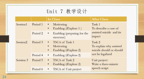 张伶俐教授以该教材的第七单元《法律与道义》为老师们做了教学设计的示范,重点说明了“驱动”、“促成”和“产出”教学环节的亮点。她表示,驱动(motivating)是POA最开始也最有创意的环节,要了解学生的语言与内容缺口;促成(enabling)是POA教学中的关键环节,包含内容促成与语言促成,指的是为帮助学生顺利实现产出目标而开展的课堂活动。张伶俐教授特别指出,产出任务的设定,一定要注意引导学生使用单元目标词汇。她为大家展示了丰富多彩的教学活动的设计,以6节课的课时,详细说明了课内、课外的各个环节的实施要点。