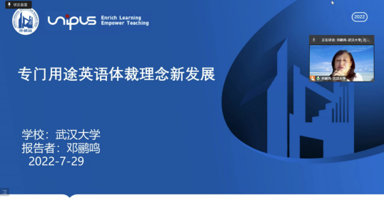邓鹂鸣教授应外研社U讲堂特邀,于2022年7月29日作了题为“专门用途英语体裁理念新发展”云端专题公益学术报告,近800名全国各地高校外语教师、硕、博士学生在线参听,报告紧密结合我国“新外语”建设目标,系统阐述了在不同层级的专门用途英语教学中有机融合常规体裁分析理念与批评性体裁分析新理念的必要性及其具体教学实践机制,受到邀请方及参听的一线外语教师、硕、博学生的积极好评。外研社U讲堂为开放、互动、发展的教师专业发展的在线平台,旨在构建辐射全国高校外语教师和发展在线共同体,助力广大外语教师学术交流、启迪思路、实现共同体成员互助协同、整体发展,近年由外研社U讲堂推出的系列公益学术讲座在全国外语界反响热烈,大力促进了外语教师专业理论素养的提升及教师发展。