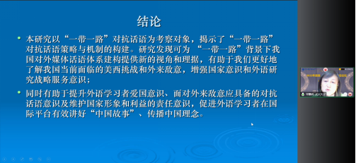 报告结尾,邓鹂鸣教授强调:“一带一路”对抗话语研究有助于提升外语学习者爱国意识、面对外来敌意应具备的对抗话语意识及维护国家形象和利益的责任意识,以助力外语学习者在国际舞台讲好中国故事,传播中国理念。