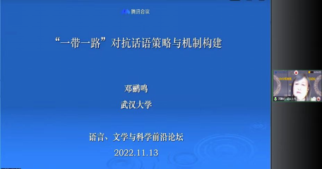 邓鹂鸣教授应2022年语言、文学与科学前沿论坛特邀,于2022年11月13日作了题为“一带一路”对抗话语策略与机制构建的云端主题学术报告。该论坛由中国科学技术史学会语言、文学与科学研究院专业委员会主办,由中国科学院大学外语系、浙江科技学院外国语学院承办,外语教学与研究出版社、北京蓝海达信科技有限公司协办,与会人员4000多人。邓鹂鸣教授作为中国科学技术史学会语言、文学与科学专业委员会常务理事,近年来围绕国家对外话语体系建构、增强外语研究中服务国家战略意识等主题进行了系统研究探索与实践。此次报告是相关研究成果的分享与总结,该报告获得了线上参听专家、教师及硕博学生的积极好评。