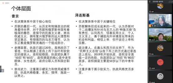 接下来,赵会荣教授针对力量格局、主要力量、主要矛盾、斗争焦点、战略结果等方面剖析了当今俄乌局势中存在的一些主要问题。在这一部分,赵会荣教授重点阐明了俄罗斯与乌克兰的两位国家总统之间的个人作用与特征。