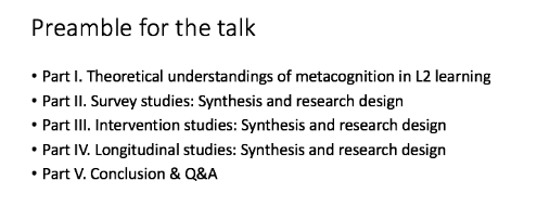 本讲座探讨了元认知和第二语言写作之间的关系,并讨论如何有效地将元认知策略纳入写作教学。讲座首先介绍元认知的概念及其组成部分,以及如何在语言学习中应用。接下来,讲座深入探讨了元认知意识如何影响第二语言写作表现,审视多种元认知策略,帮助学习者提高写作水平,例如目标设定、规划、自我评价和自我调节。讲座还讨论了如何向第二语言学习者明确这些策略,并将其整合到写作过程中。此外,讲座阐明了将元认知策略纳入第二语言写作教学的挑战和限制,探讨了研究结果对第二语言写作教学的启示,提出了未来相关研究的设计。