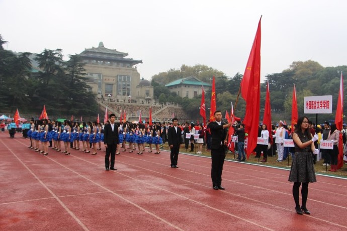 早上8点,伴随着雄壮的运动员进行曲,开幕式正式开始。首先是国旗班手持国旗,踏着铿锵的步伐而来。随后,各学院运动员方阵依次进场。他们个个衣着鲜艳,昂首阔步地走向主席台,将青年应有的朝气和活力淋漓尽致的展现出来。尤其是外国语学院的女生们,她们迎面而来,身着蓝裙,步伐优雅有力,以简短俏皮的踢踏舞和响亮的口号向我们展现了武大外院人活力四射、朝气蓬勃的精神风貌。