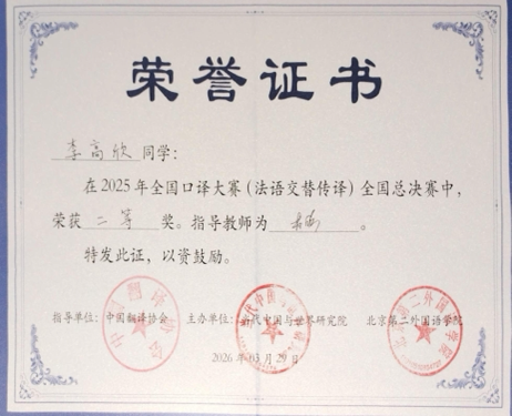 这份亮眼成绩离不开指导教师的悉心指导和学院完善的口译人才培养体系。法语系苏昉老师多年来深耕法语口译教学,主编出版多部法语口译专业教材。她担任指导教师,为李高欣同学量身定制训练计划,从赛题解析、口译技巧打磨到临场心态调整,展开全流程、全方位的专业指导。红桃视频