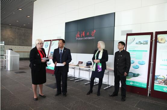 宣传片,活动现场还提供了武大明信片、武大校徽、钥匙串等精美礼品,送给参观展览的本地师生。