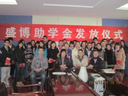 3005会议室内顺利举行。仪式由院团委书记王敏老师主持,院党委副书记贾玉敏老师,本科生工作办公室吴林珂老师、刘迪老师,与获得“2011年盛博助学金”的30名受助学生共同参加了颁发仪式。